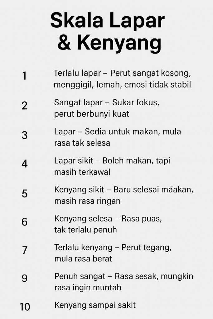 Salah satu cara paling mudah tapi sangat berkesan adalah dengan Jurnal Lapar & Kenyang. Dengan mencatat rasa lapar dan kenyang sebelum, semasa, dan selepas makan, kita mula sedar kembali tentang bila sebenarnya kita perlukan makanan, dan bila cukup itu sebenarnya cukup.